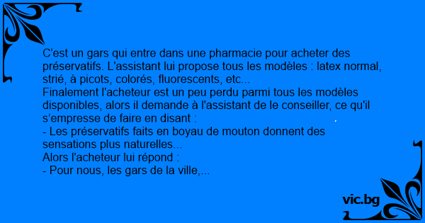 C'est un gars qui entre dans une pharmacie pour acheter des préservatifs. L'assistant lui propose tous les modèles : latex normal, strié, à picots, colorés, fluorescents, etc...