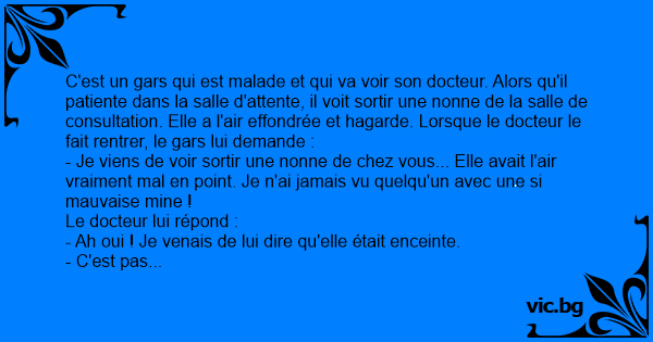 C'est un gars qui est malade et qui va voir son docteur. Alors qu'il patiente dans la salle d'attente, il voit sortir une nonne de la salle de consultation. Elle a l'air effondrée et hagarde. Lorsque le docteur le fait rentrer, le gars lui demande :
