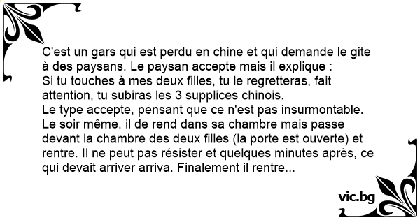 C'est un gars qui est perdu en chine et qui demande le gite à des paysans. Le paysan accepte mais il explique :
