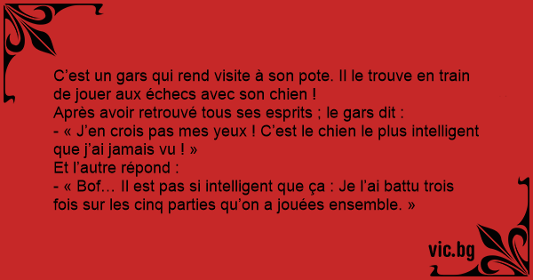 Schach spielen A man went to visit a friend and was amazed to find him playing chess with his dog. Бойко Борисов играел шах с кучето си. Минал Цветанов и казал: - Ех, много ти е умно кучето. ББ-то се намръщи и казал: - Аааа, умно то, 1:1 сме! Un signore sta percorrendo una strada residenziale, quando vede in un giardino un bambino che gioca a scacchi con un cane. Poiché e' un fatto alquanto insolito, il signore si ferma a guardare i due che giocano. Dopo 5 minuti, il cane fa scacco-matto. Cosi' il signore dice: "Hai davvero un cane... Jaś gra z psem w szachy. - Masz bardzo mądrego psa - komentuje z uznaniem kolega. - Wcale nie jest taki mądry! Ani razu jeszcze nie wygrał. - Pero, este perro es inteligentísimo, ¡Juega al ajedrez! ¡Vale una fortuna! - No te creas... Le he ganado tres partidas de cinco. In a park people come across a man playing chess against a dog. They were astonished and said: "What a clever dog!" But the man protested and replied: "No, no, he isn't that clever. I'm leading... Egymással szemben ül a sakktáblánál egy ember meg egy kutya. Odamegy hozzájuk egy másik ember: - Uram, ez fantasztikus. Ez a kutya tud sakkozni? - Dehogy tud. Én vezetek 3-1-re. In parc un politist si cainele sau jucau sah. Un trecator mirat de ceea ce vede se adreseaza politistului -D-le, ce caiine destept aveti! Stie sa joace sah! La care politistul raspunde:... Pe terasa unei cafenele, se petrece de cîtăva vreme o scenă ciudată: un om şi un cîine stau faţă în faţă, avînd între ei o tablă de şah. Mirat, un tip întreabă: - Cum, cîinele dv. ştie cu adevărat... En mann besøkte sin venn og så forskrekket at vennen spilte sjakk med hunden sin. Han så på en stund, før han utbrøt: - ”Det er den smarteste hunden jeg har sett!” - ”Næh, han er ikke så smart”,... Ein Mann spielt Schach mir seinem Hund. Ein zweiter Mann tritt hinzu: "Sie haben aber einen klugen Hund." - "Wieso, er verliert doch immer."