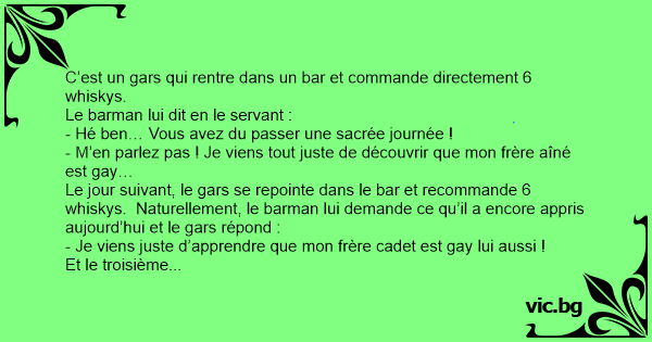 Le jour suivant, le gars se repointe dans le bar et recommande 6 whiskys. Naturellement, le barman lui demande ce qu’il a encore appris aujourd’hui et le gars répond :