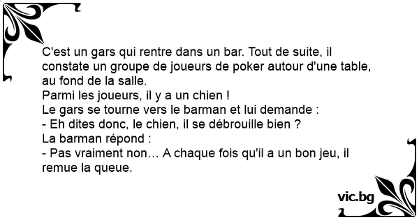 C'est un gars qui rentre dans un bar. Tout de suite, il constate un groupe de joueurs de poker autour d'une table, au fond de la salle.