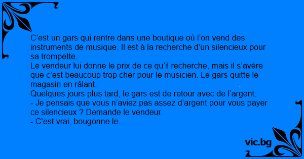 C’est un gars qui rentre dans une boutique où l’on vend des instruments de musique. Il est à la recherche d’un silencieux pour sa trompette.