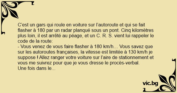 C’est un gars qui roule en voiture sur l’autoroute et qui se fait flasher à 180 par un radar planqué sous un pont. Cinq kilomètres plus lоin, il est arrêté au péage, et un C. R. S. vient lui rappeler le code de la route: