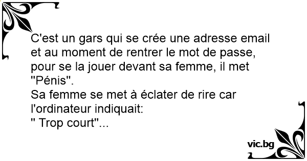 Un gars un peu obsédé s'inscrit sur un site internet. Après avoir tapé son adresse-mail, l'ordi lui demande un mot de passe. Alors, il écrit : "ma bite". Un message s'affiche : "Trop court. Désolé,...