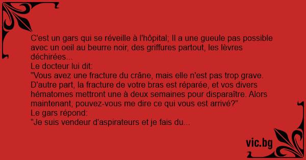 "Je suis vendeur d'aspirateurs et je fais du porte-à-porte. Je sonne à la porte d'une maison, une femme m'ouvre, j'entre et je vide tout un sac de saletés, de cailloux même le contenu d'une litière de chat sur la moquette du salon. Puis, je lui dis que grâce à mon SuperPompeur l'Aspirateur, je vais lui nettoyer ça en deux coups de cuiller à рот."