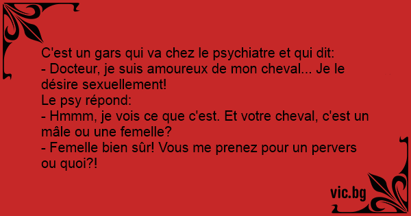 Un homme va chez son psy et lui dit : - Docteur, il faut que je vous dise, je suis tombé amoureux de mon cheval... - De votre cheval? - Oui docteur de mon cheval, et je le désire sexuellement... -...