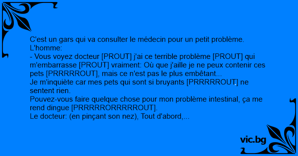 - Vous voyez docteur [PROUT] j'ai ce terrible problème [PROUT] qui m'embarrasse [PROUT] vraiment: Où que j'aille je ne peux contenir ces pets [PRRRRROUT], mais ce n'est pas le plus embêtant...