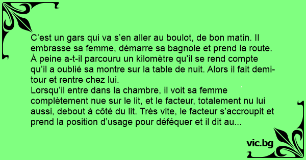 Lorsqu’il entre dans la chambre, il voit sa femme complètement nue sur le lit, et le facteur, totalement nu lui aussi, debout à côté du lit. Très vite, le facteur s’accroupit et prend la position d’usage pour déféquer et il dit au mari :