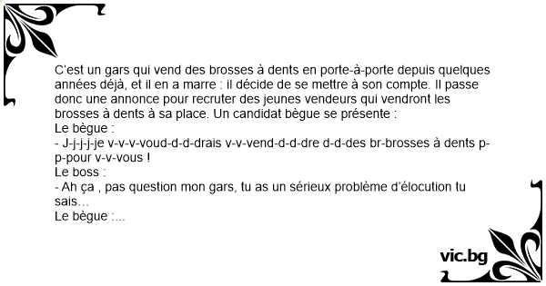 C’est un gars qui vend des brosses à dents en porte-à-porte depuis quelques années déjà, et il en a marre : il décide de se mettre à son compte. Il passe donc une annonce pour recruter des jeunes vendeurs qui vendront les brosses à dents à sa place. Un candidat bègue se présente :