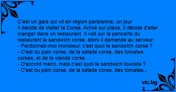 C'est un gars qui vit en région parisienne, un jour il décide de visiter la Corse. Arrivé sur place, il décide d'aller manger dans un restaurant. Il voit sur la pancarte du restaurant le sandwich corse, alors il demande au serveur: