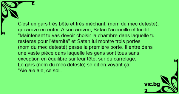 C'est un gars très bête et très méchant, (nom du mec detesté), qui arrive en enfer. A son arrivée, Sатаn l'accueille et lui dit: