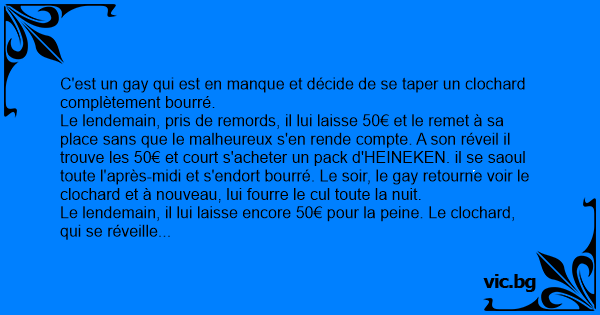 Le lendemain, pris de remords, il lui laisse 50€ et le remet à sa place sans que le malheureux s'en rende compte. A son réveil il trouve les 50€ et court s'acheter un pack d'HEINEKEN. il se saoul toute l'après-midi et s'endort bourré. Le soir, le gаy retourne voir le clochard et à nouveau, lui fourre le cul toute la nuit.