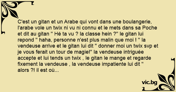 C'est un gitan et un Arabe qui vont dans une boulangerie, l'arabe vole un twix ni vu ni connu et le mets dans sa Poche et dit au gitan '' Hé ta vu ? la classe hein ?'' le gitan lui repond '' haha, personne n'est plus malin que moi ! '' la vendeuse arrive et le gitan lui dit '' donner moi un twix svp et je vous ferait un tour de magie!'' la vendeuse intriguée accepte et lui tends un twix , le gitan le mange et regarde fixement la vendeuse , la vendeuse impatiente lui dit '' alors ?! il est où ce tour de magie ?! '' le gitan lui répond :