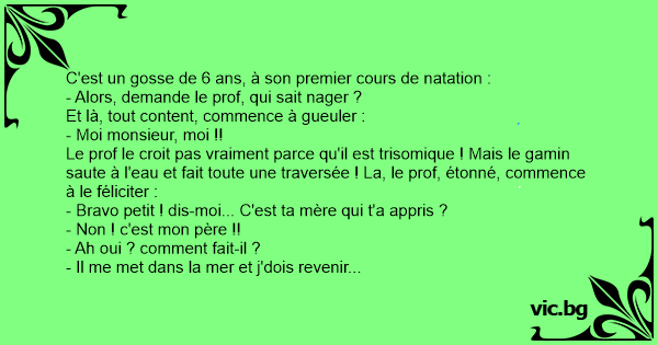 Le prof le croit pas vraiment parce qu'il est trisomique ! Mais le gamin saute à l'eau et fait toute une traversée ! La, le prof, étonné, commence à le féliciter :