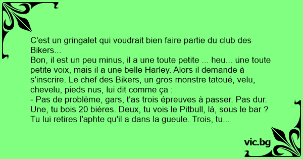 C'est un gringalet qui voudrait bien faire partie du club des Bikers... Bon, il est un peu minus, il a une toute petite ... heu... une toute petite voix, mais il a une belle Harley. Alors il demande à s'inscrire. Le chef des Bikers, un gros monstre tatoué, velu, chevelu, pieds nus, lui dit comme ça : - Pas de problème, gars, t'as trois épreuves à passer. Pas dur. Une, tu bois 20 bières. Deux, tu vois le Pitbull, là, sous le bar ? Tu lui retires l'aphte qu'il a dans la gueule. Trois, tu vois la grand'mère, sur son banc ? Tu la violes 10 fois. - Ah, ben ouais, ben j'y vais ! Bon, le type boit 10 bières, 15, 16, c'est pas facile, 17... Finalement les 20 bières y passent. Alors il va sous le comptoir, et on entend un gros bruit de lutte entre le gringalet et le Pitbull qui hurle. Énorme. Ça dure. Et le type ressort, abîmé, ébouriffé, et il demande : - Bon, elle est où, c'te vieille, que je lui retire son aphte ?