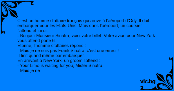 - Bonjour Monsieur Sinatra, voici votre billet. Votre avion pour New York vous attend porte 6.