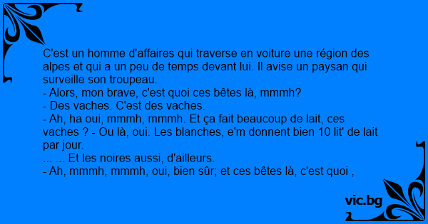 - Ah, ha oui, mmmh, mmmh. Et ça fait beaucoup de lait, ces vaches ? - Ou là, oui. Les blanches, e'm donnent bien 10 lit' de lait par jour.