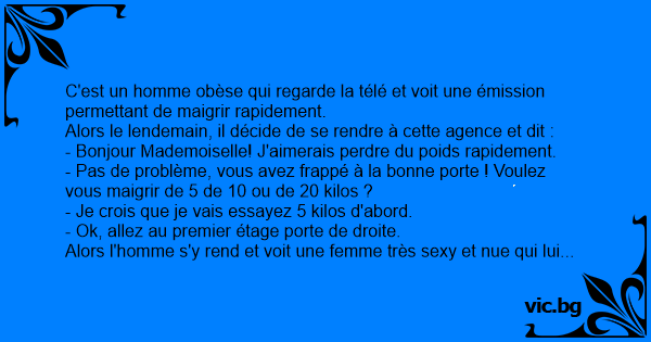 - Pas de problème, vous avez frappé à la воnnе porte ! Voulez vous maigrir de 5 de 10 ou de 20 kilos ?