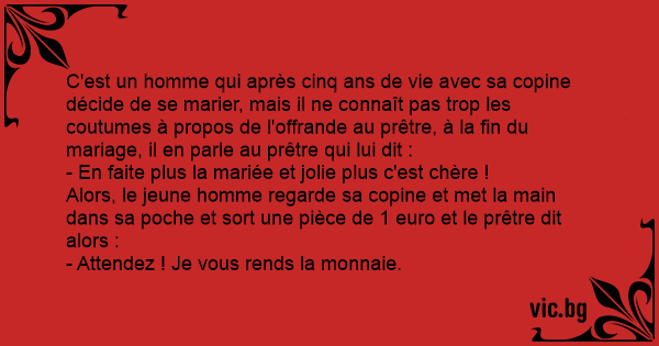 Alors, le jeune homme regarde sa copine et met la main dans sa poche et sort une pièce de 1 euro et le prêtre dit alors :