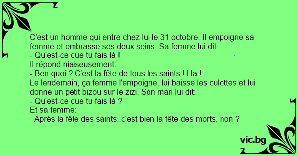 C'est un homme qui entre chez lui le 31 octobre. Il empoigne sa femme et embrasse ses deux seins. Sa femme lui dit: