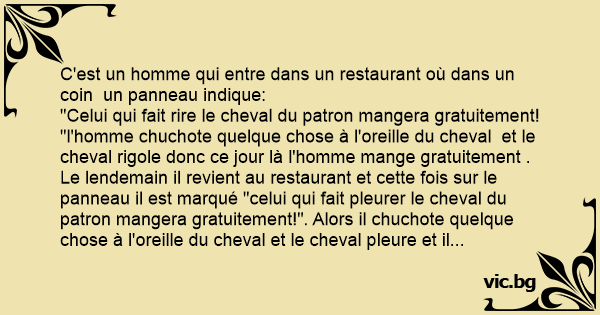 "Celui qui fait rire le cheval du patron mangera gratuitement! "l'homme chuchote quelque chose à l'oreille du cheval et le cheval rigole donc ce jour là l'homme mange gratuitement . Le lendemain il revient au restaurant et cette fois sur le panneau il est marqué "celui qui fait pleurer le cheval du patron mangera gratuitement!". Alors il chuchote quelque chose à l'oreille du cheval et le cheval pleure et il remange gratuitement. Puis le patron lui demande comment avez-vous fait pour faire rire puis pleurer mon cheval? Et l'homme répond : la première fois pour le faire rire je lui est dit " j'ai un plus gros реnis que toi " et la deuxième fois pour le faire pleurer : je lui ai montré !