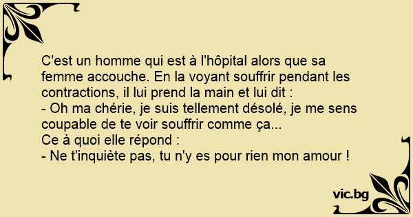 C'est un homme qui est à l'hôpital alors que sa femme accouche. En la voyant souffrir pendant les contractions, il lui prend la main et lui dit :