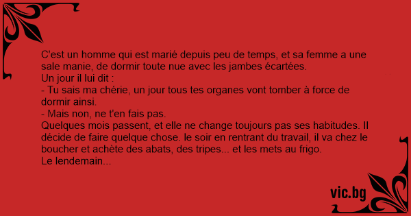 C'est un homme qui est marié depuis peu de temps, et sa femme a une sale manie, de dormir toute nue avec les jambes écartées.