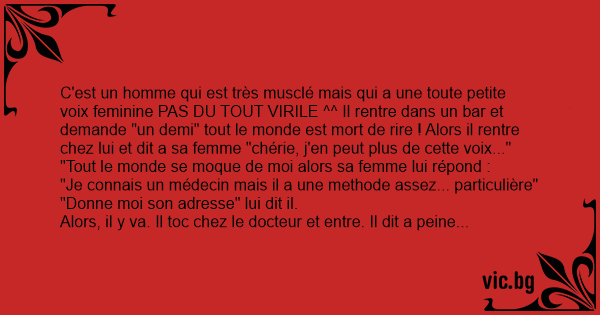 C'est un homme qui est très musclé mais qui a une toute petite voix feminine PAS DU TOUT VIRILE ^^ Il rentre dans un bar et demande "un demi" tout le monde est mort de rire ! Alors il rentre chez lui et dit a sa femme "chérie, j'en peut plus de cette voix..."