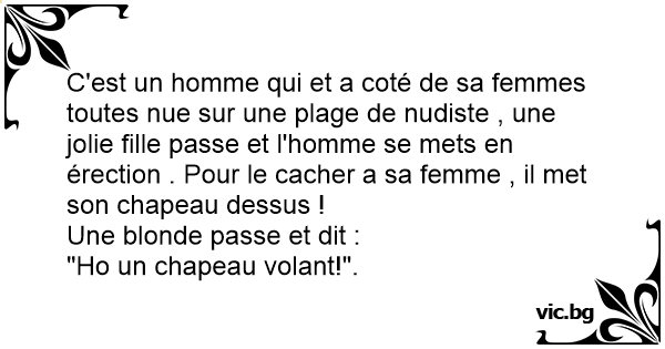 C'est un homme qui et a coté de sa femmes toutes nue sur une plage de nudiste , une jolie fille passe et l'homme se mets en érection . Pour le cacher a sa femme , il met son chapeau dessus !