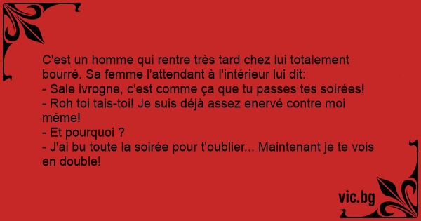 C'est un homme qui rentre très таrd chez lui totalement bourré. Sa femme l'attendant à l'intérieur lui dit: