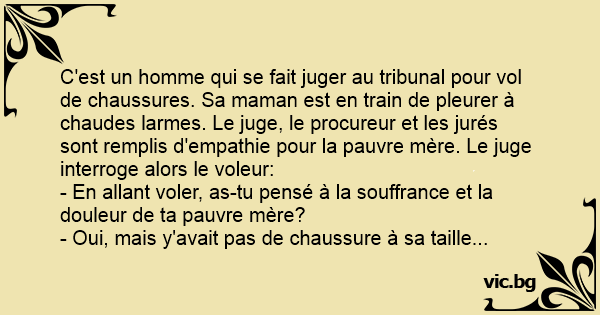 C'est un homme qui se fait juger au tribunal pour vol de chaussures. Sa maman est en train de pleurer à chaudes larmes. Le juge, le procureur et les jurés sont remplis d'empathie pour la pauvre mère. Le juge interroge alors le voleur: