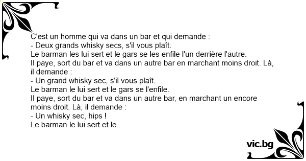 Il paye, sort du bar et va dans un autre bar, en marchant un encore moins droit. Là, il demande :