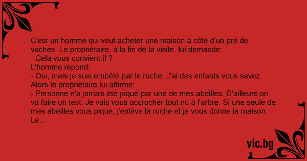 C'est un homme qui veut acheter une maison à côté d'un pré de vaches. Le propriétaire, à la fin de la visite, lui demande: