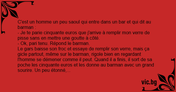 Le gars baisse son froc et essaye de remplir son verre, mais ça gicle partout, même sur le barman, rigole bien en regardant l'homme se démener comme il peut. Quand il a finis, il sort de sa poche les cinquante euros et les donne au barman avec un grand sourire. Un peu étonné, celui-ci demande: