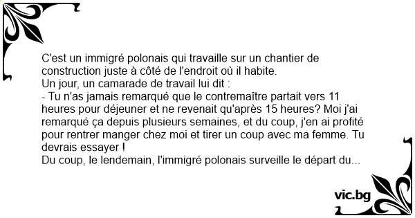 - Tu n'as jamais remarqué que le contremaître partait vers 11 heures pour déjeuner et ne revenait qu'après 15 heures? Moi j'ai remarqué ça depuis plusieurs semaines, et du coup, j'en ai profité pour rentrer manger chez moi et tirer un coup avec ma femme. Tu devrais essayer !