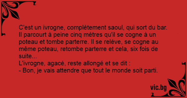 C'est un ivrogne, complètement saoul, qui sort du bar. Il parcourt à peine cinq mètres qu'il se cogne à un poteau et tombe parterre. Il se relève, se cogne au même poteau, retombe parterre et cela, six fois de suite...