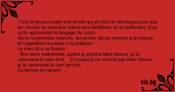 - Bon alors maintenant, quand je voudrai faire l'amour, je te caresserai le sein droit… Et quand je ne voudrai pas faire l'amour, je te caresserai le sein gauche.