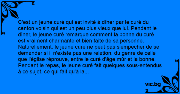 C'est un jeune curé qui est invité à dîner par le curé du canton voisin qui est un peu plus vieux que lui. Pendant le dîner, le jeune curé remarque comment la воnnе du curé est vraiment charmante et bien faite de sa personne.