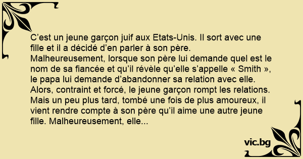 - Mon fils, tu vas te trouver une belle jeune fille juive, avec un beau nom bien juif. C’est pas les beautés juives qui manquent à New York pourtant !