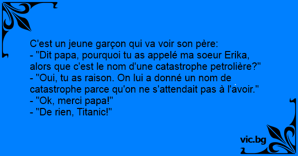 - "Dit papa, pourquoi tu as appelé ma soeur Erika, alors que c'est le nom d'une catastrophe petrolière?"