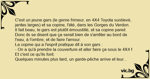 Il fait beau, le gars est plutôt émoustillé, et sa copine pareil. Donc ils se disent que ça serait bien de s'arrêter au bord de l'eau, à l'ombre, et de faire l'amour.