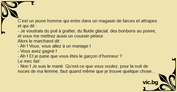 - Non ! Je suis le marié. Qu’est-ce que vous voulez, pour la nuit de noces de ma femme, faut quand même que je trouve quelque chose d’original !