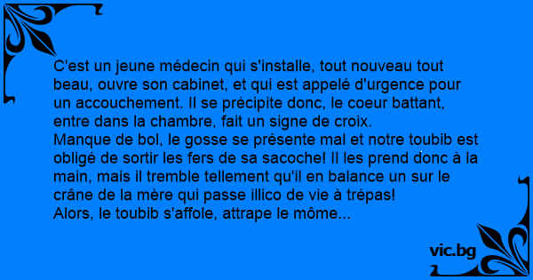 Le jeune toubib, voyant l'entendue du désastre, décide d'aller s'installer ailleurs, dans une autre ville, assez lоin de là. Il fait ses bagages et hop! Un mois plus таrd, il ouvre timidement un nouveau cabinet, et paf! ça ne loupe pas! V'la ti pas qu'on l'appelle d'urgence pour un accouchement!!!