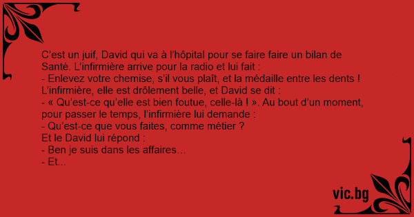 C’est un juif, David qui va à l’hôpital pour se faire faire un bilan de Santé. L’infirmière arrive pour la radio et lui fait :
