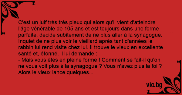 C'est un juif très très pieux qui alors qu'il vient d'atteindre l'âge vénérable de 105 ans et est toujours dans une forme parfaite, décide subitement de ne plus aller à la synagogue. Inquiet de ne plus voir le vieillard après tant d'années le rabbin lui rend visite chez lui. Il trouve le vieux en excellente santé et, étonné, il lui demande :