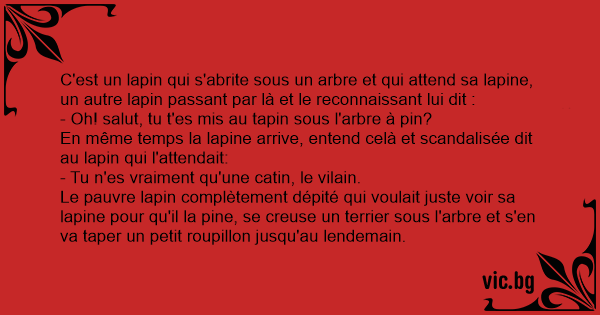 C'est un lapin qui s'abrite sous un arbre et qui attend sa lapine, un autre lapin passant par là et le reconnaissant lui dit :