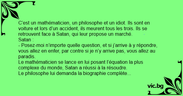 C’est un mathématicien, un philosophe et un idiот. Ils sont en voiture et lors d’un accident, ils meurent tous les trois. Ils se retrouvent face à Sатаn, qui leur propose un marché.
