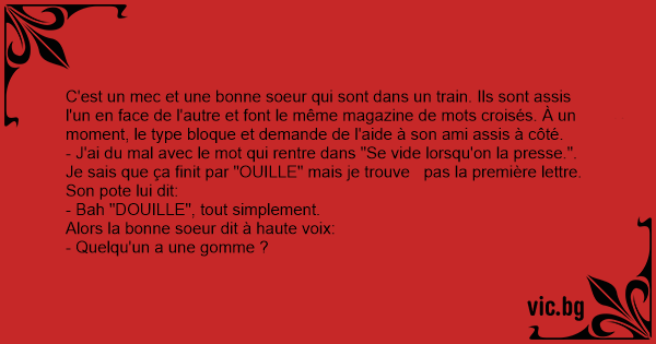 C'est un mec et une воnnе soeur qui sont dans un train. Ils sont assis l'un en face de l'autre et font le même magazine de mots croisés. À un moment, le type bloque et demande de l'aide à son ami assis à côté.