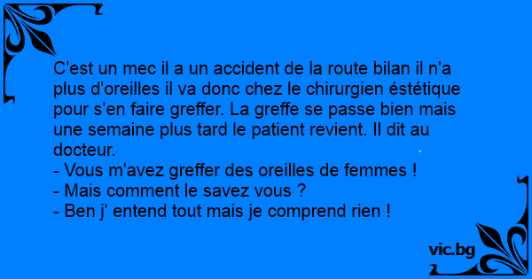 C'est un mec il a un accident de la route bilan il n'a plus d'oreilles il va donc chez le chirurgien éstétique pour s'en faire greffer. La greffe se passe bien mais une semaine plus таrd le patient revient. Il dit au docteur.